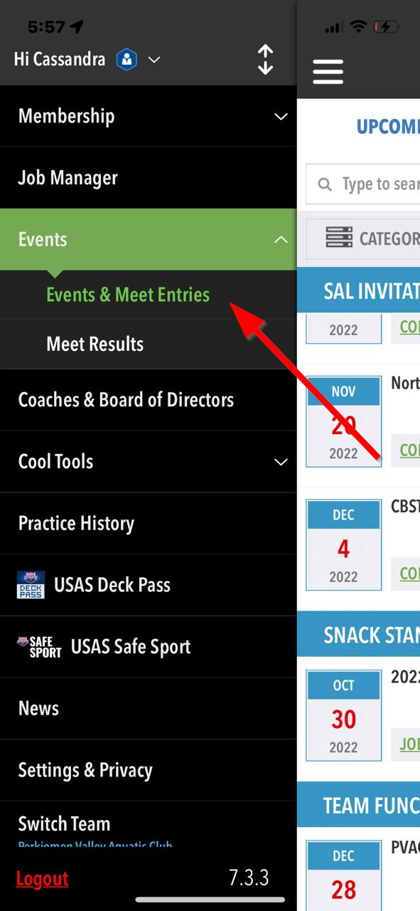 Navigate to the main menu and select Events > Events & Meet Entries: