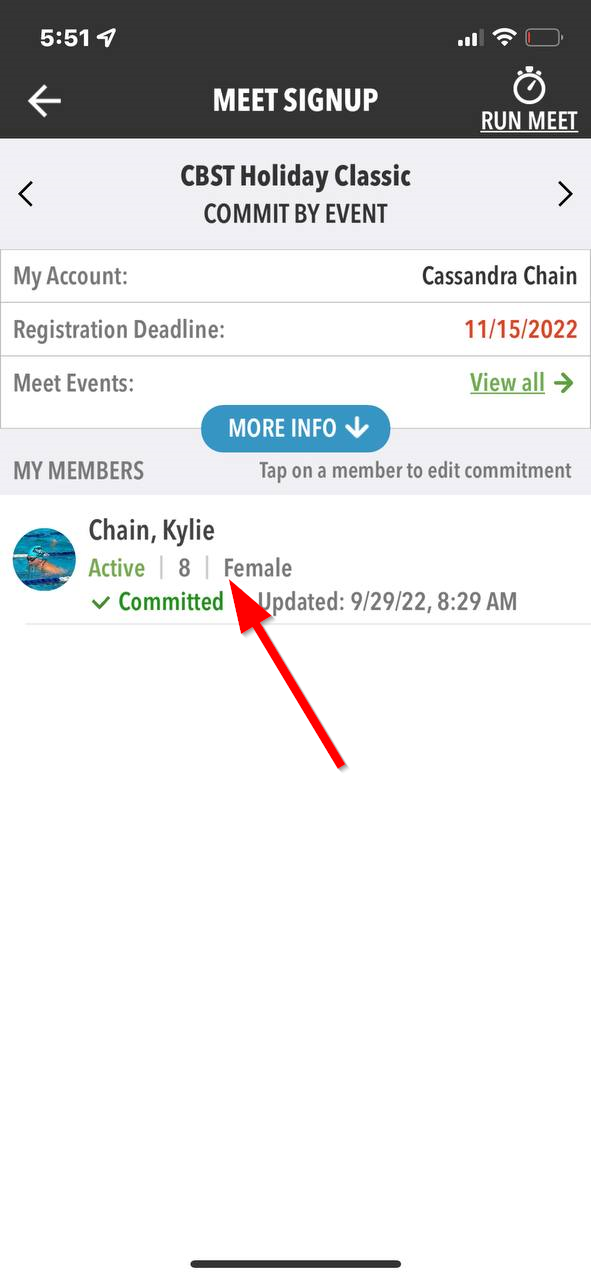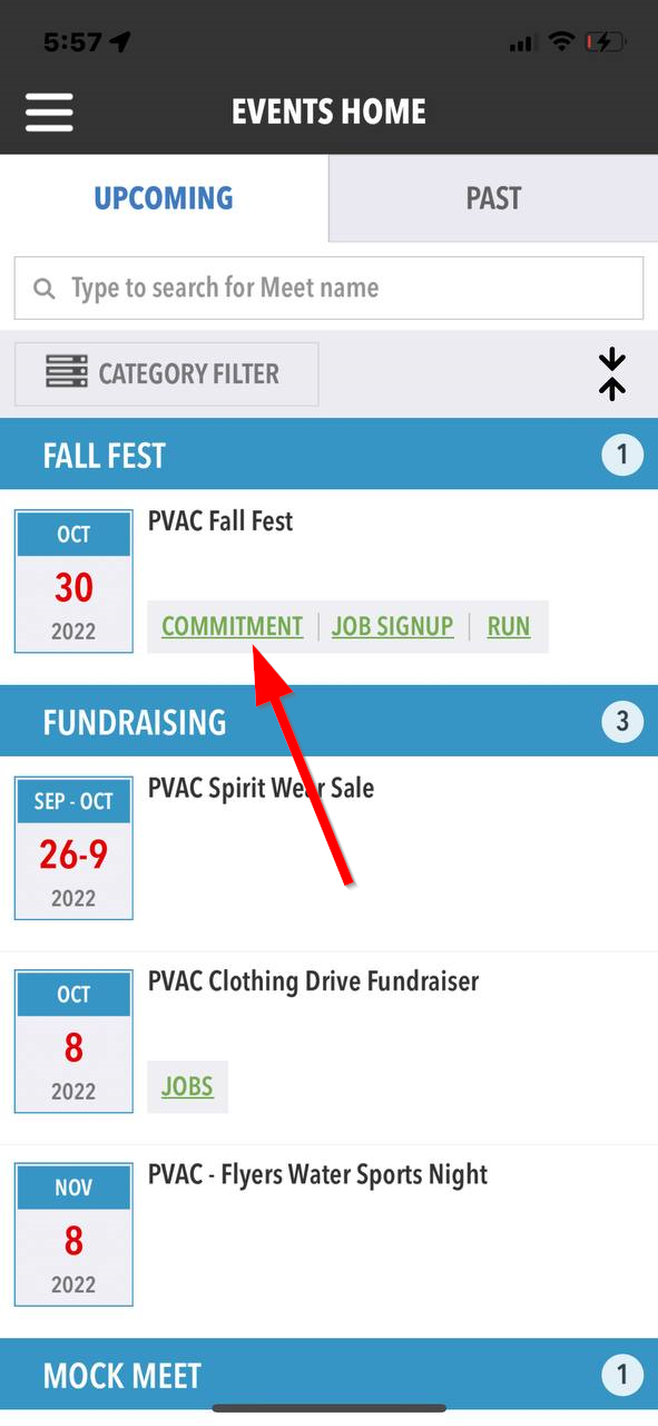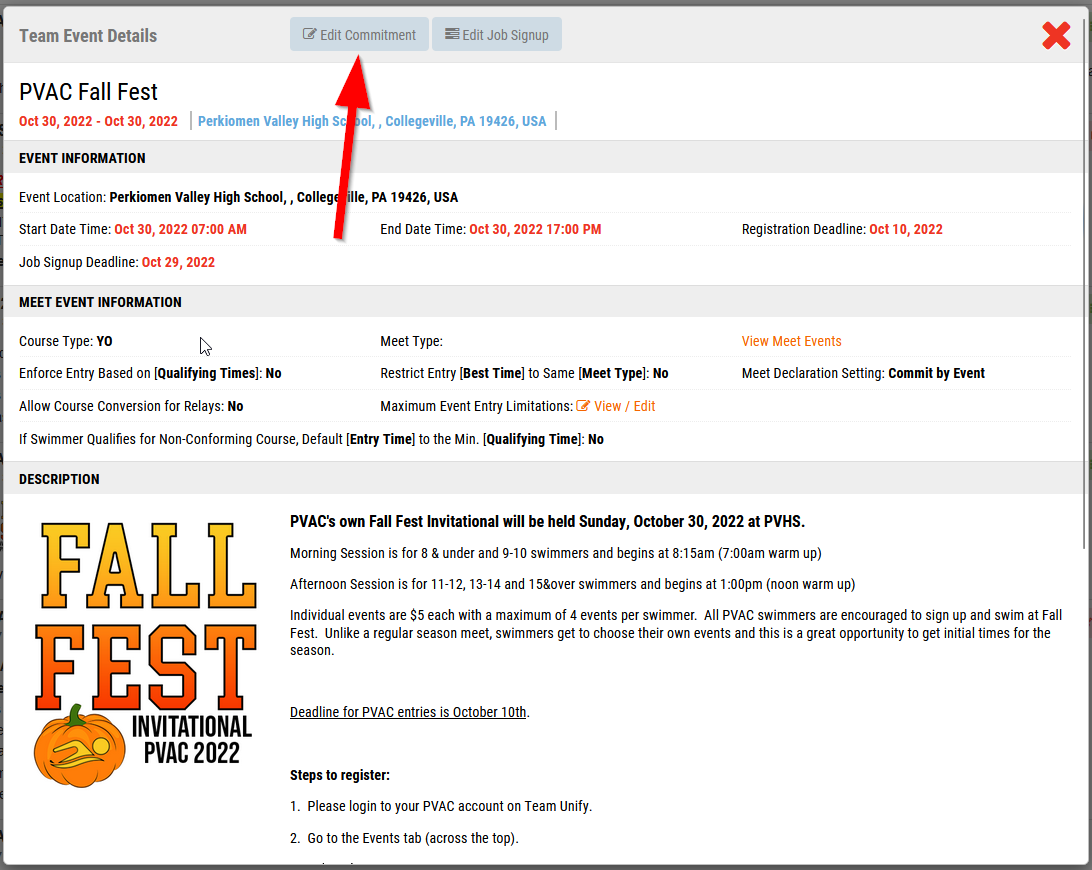 Click on the team event you are interested in registering for and select "edit commitment" at the top: