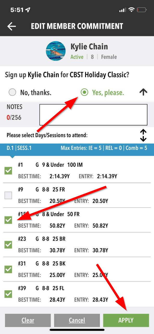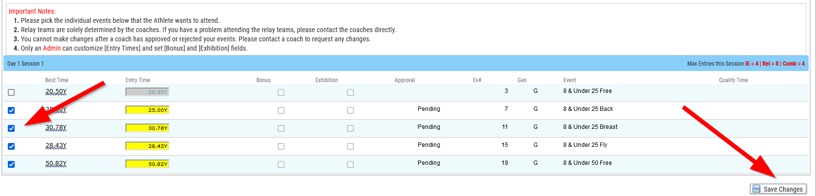 Select which events you wish for your swimmer to participate in and click "Save Changes":